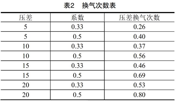 有些項目僅僅按照換氣次數(shù)法計算滲透風量(見表1、表2),而忽略其他因素,筆者認為合理的方法應是綜合計算房間圍護結構滲透風量和門的滲透量;這樣才能保證正確的房間壓差平衡和變風量閥選型,有利于正確的風機風量選型。