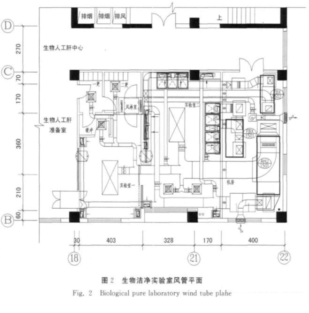 生物潔凈實驗室設實驗室1(用于動物解剖取肝)、實驗室2(用于人工肝實驗)及其相應的輔助用房。實驗人員通過一更、二更經風淋后進入實驗室,由緩沖經一更離開實驗室;物品則通過傳遞窗進出。人物分流、潔污分流的合理布局,避免了交叉感染,從客觀條件上提高了實驗數(shù)據(jù)的精確性。實驗室1、實驗室2中心區(qū)域設置百級送風天花,實驗室2根據(jù)需要另設兩個百級層流工作臺送風罩。凈化空調機組放置于旁邊的房間里。